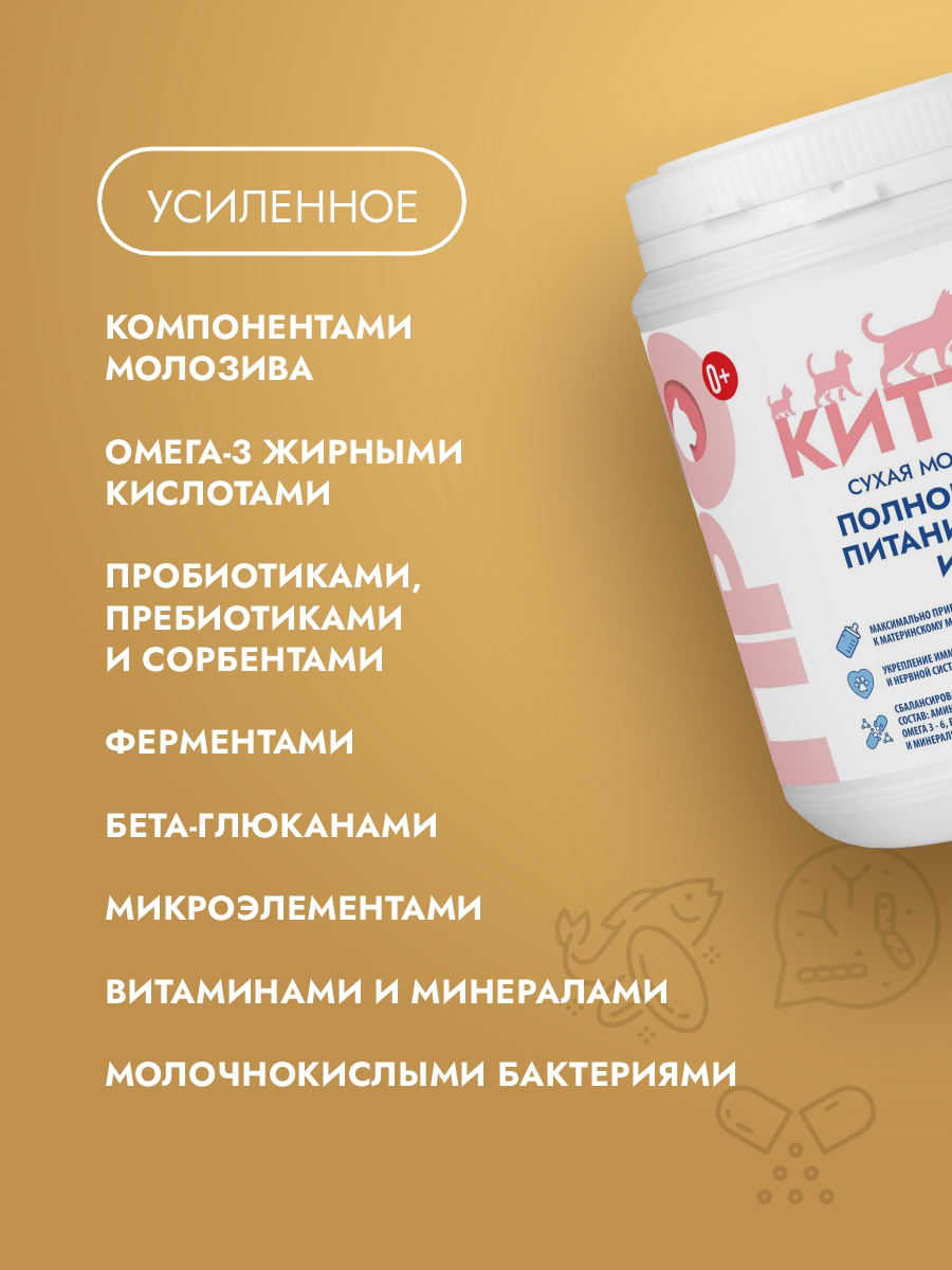 Содержит все необходимые витамины и минералы, которые способствуют правильному развитию котенка, укрепляют иммунитет и поддерживают общий тонус организма. Его легко использовать: просто растворите порошок в теплой воде, следуя инструкции, и продукт готов к употреблению.